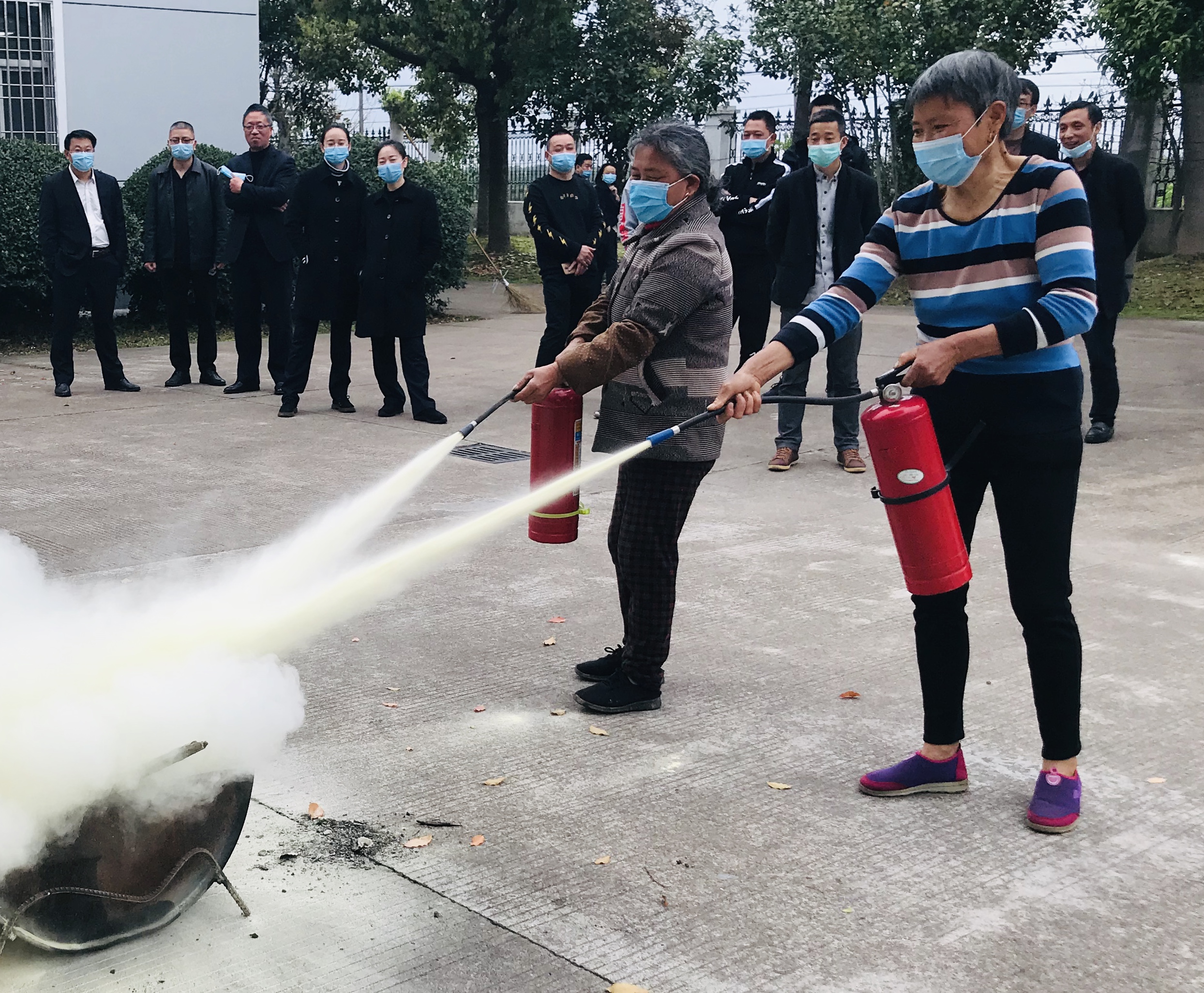 圖為使用滅火器演練 隨后,該所開(kāi)展滅火器使用模擬演練。在演練中,大家利用平時(shí)更換下來(lái)的舊滅火器,依次輪流進(jìn)行操作,更有一些員工主動(dòng)熱心幫助保潔阿姨們講解如何正確使用滅火器,以身示范正確操作方式及每一個(gè)分解動(dòng)作要領(lǐng)。