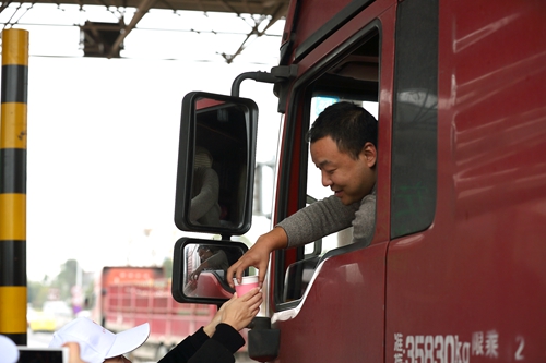 圖為志愿者合影 “師傅,喝一杯紅糖姜茶暖和一下吧。” “師傅,您這是貨車,這里有一份貨車非現(xiàn)金支付優(yōu)惠的單子,請(qǐng)了解一下。”