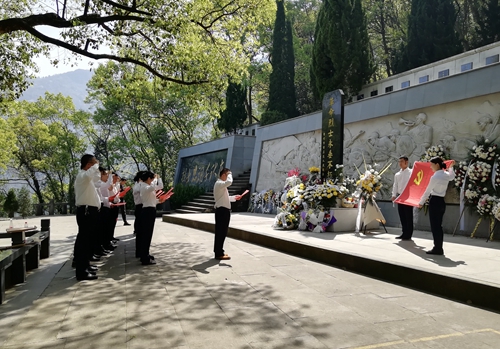 圖為敬獻鮮花 九峰烈士陵園始建于1956年,埋葬著20世紀50年代為國捐軀的120余位革命先烈。墓區(qū)內青松翠柏環(huán)繞,墓前豎有一座“革命烈士永垂不朽”的石碑。上午10時許,祭掃儀式開始,全體人員懷著無比崇敬的心情向革命先烈鞠躬默哀,緊接著依次走到紀念碑前敬獻鮮花,表達對革命先驅的悼念與緬懷之情。在紀念碑前,全體黨員重溫入黨誓詞“我志愿加入中國共產黨,擁護黨的綱領,遵守黨的章程......”