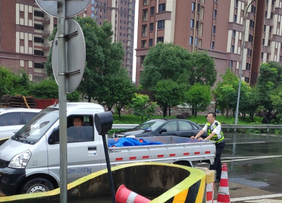 車輛故障拋錨 收費(fèi)員冒雨推行 7月4日中午12時(shí)30分左右,一輛牌照為浙開(kāi)頭的五菱小貨車停在臺(tái)州收費(fèi)所出口5號(hào)車道安全島邊上許久未動(dòng),來(lái)往車輛紛紛避開(kāi)該車道。當(dāng)班班長(zhǎng)郭斯泓發(fā)現(xiàn)這一情況后立即上前詢問(wèn),并在該車后放置隔離桶,提醒駕駛員打開(kāi)雙閃燈。