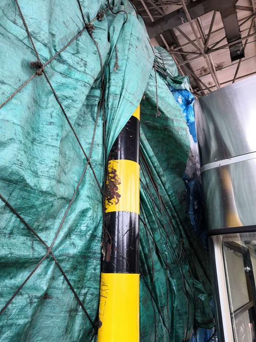 圖為篷布纏繞防撞柱 在與司機(jī)溝通后,工作人員用剪刀剪開篷布及尼龍網(wǎng),司機(jī)和陳軍用工具頂住貨物防止貨物墜落。經(jīng)過近20分鐘的努力,終于將篷布與防撞柱分離。 在此,筆者提醒各位貨車司機(jī),出發(fā)前一定要仔細(xì)檢查車上綁扎物是否扎緊,避免因自身疏忽造成不必要的損失。 洪燈杰
