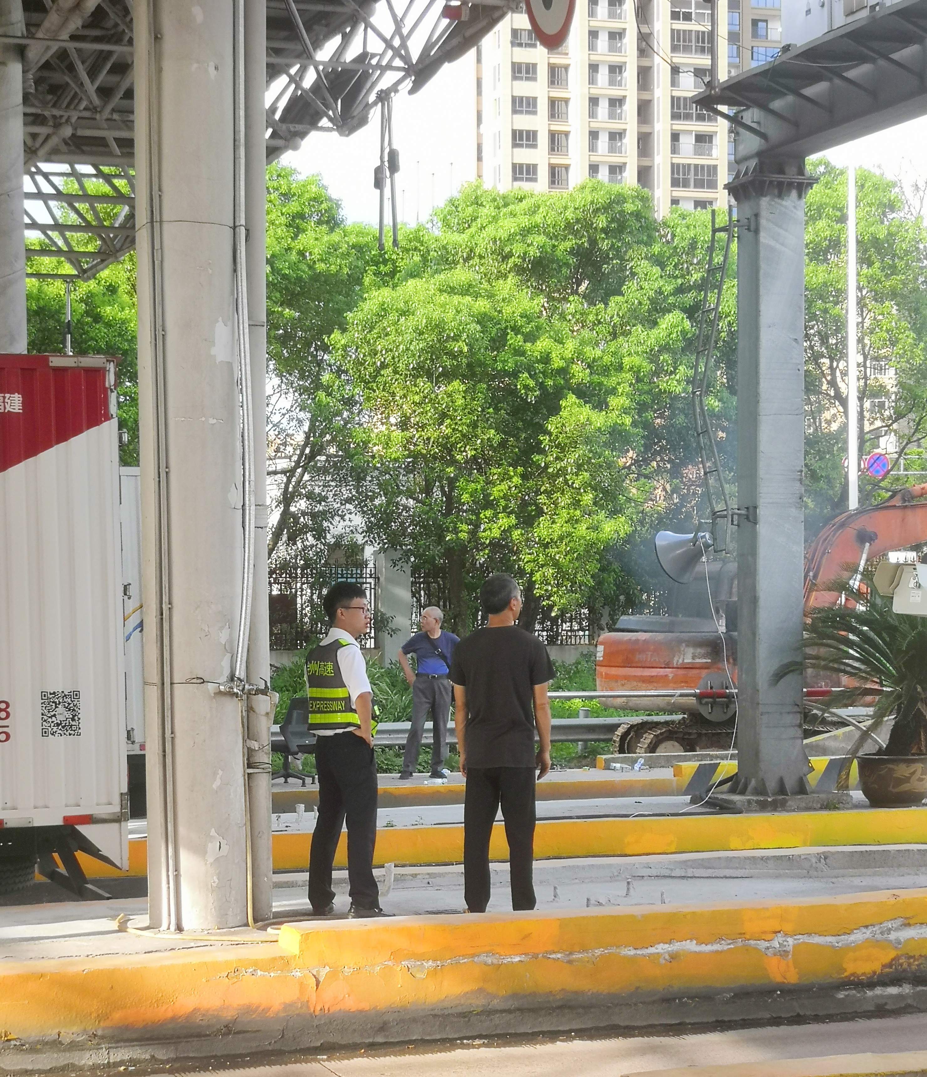 圖為收費員幫忙在車道蹲守 弄明白事情原委后,收費員立即把情況反應給了班長和治安崗亭的駐勤人員,同時安撫他們不要著急,提醒他們馬上報警。而后,工作人員陪同他們在入口處蹲守了半小時。最終,兩名男子對工作人員進行了感謝,表示接到家人和警方的電話,隨即匆匆離去。 在此提醒大家,遇到緊急情況要沉著冷靜,要第一時間選擇報警,切勿自己盲目行動。同時高速公路禁止行人、非機動車駛入,禁止無關人員在收費站周邊逗留,以免發生安全事故。 洪燈杰