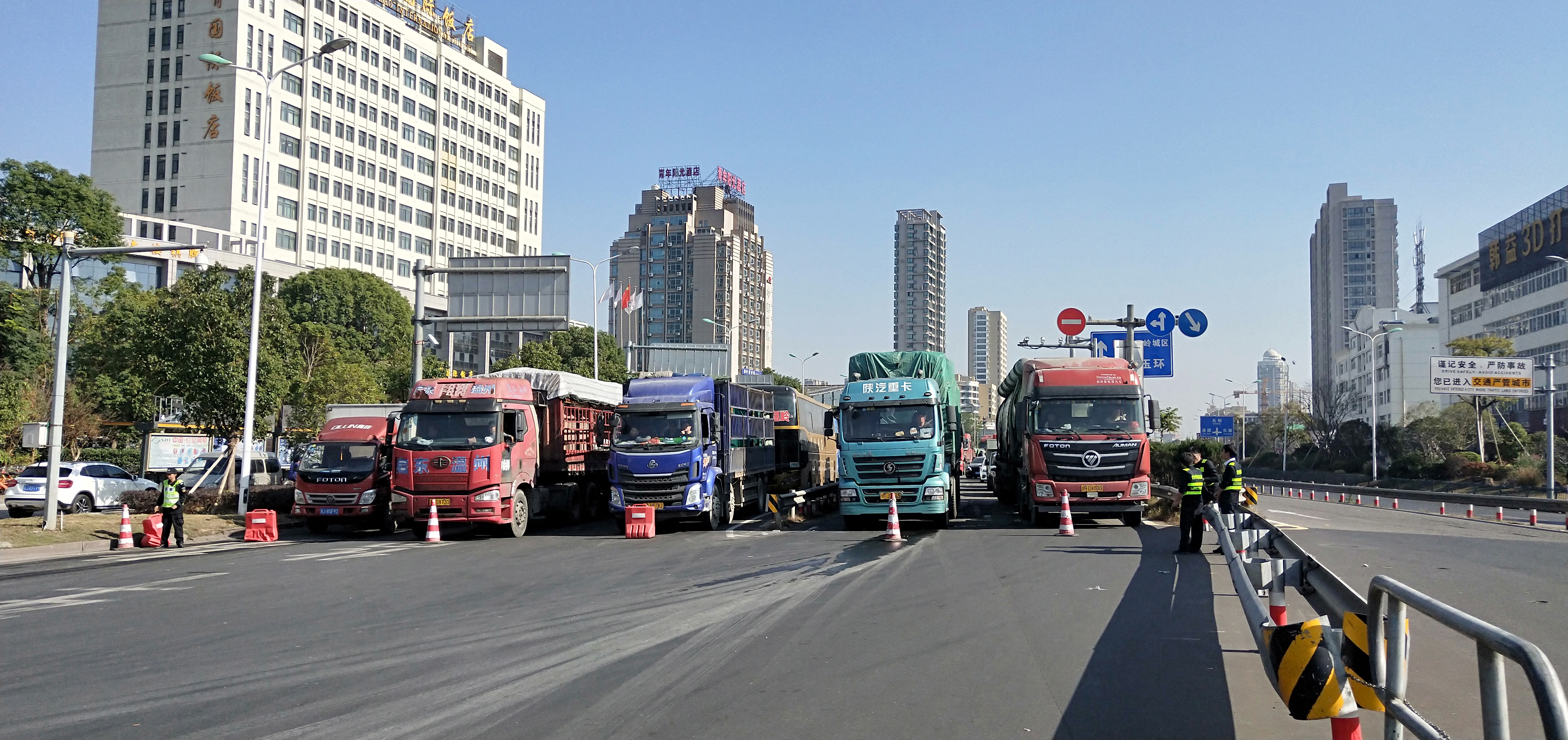 圖為所班子成員帶頭指揮交通 早上8點11分,接到監控中心電話:入口開通,開足兩個人工車道。當時正值新收費模式開通前對稱重超限車輛勸返工作的開始。經過幾個小時封道,此時的入口車流已經一望無際,如果碰到超限車輛,勸返更是難上加難。 在困難中想對策,所領導班子成員提出“輪流式放行”:入口的車輛分別是從橋上和橋下過來,分為4個車道,每個車道輪流放行5分鐘,這樣井然有序,不容易造成擁擠和交通事故,并且可以快速放行。每個車道前都擺放了一個小紅帽,專人看守。其他人員分別在入口指揮,藍牌貨車和未安裝ETC的車輛從大小客車車道通行,大貨車從混合車道通行,裝有ETC的客車和集裝箱走ETC專用通道。大家不斷穿梭在車道、廣場之間,向司機一遍遍耐心解釋,指揮每一輛車順利通行。1名孕婦行動不便,被分在監控室接聽電話,查詢入口無信息的車道。所有人一身汗,忙得顧不上喝一口水,臨近飯點也沒有人主動去吃飯,大家都頂住壓力,從黎明到黃昏一心想著快速準確高效放行。