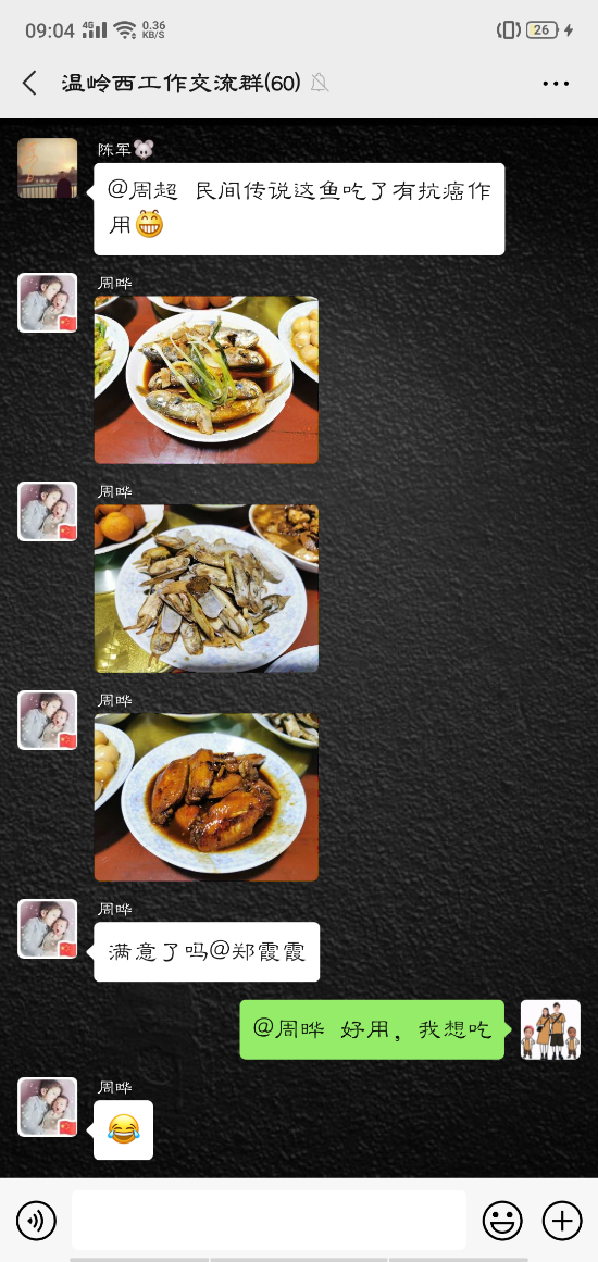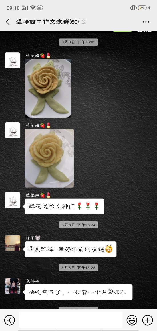 活動中,大家的參與性都很高,紛紛在微信群內曬出自己制作的美食:鹽焗雞、可樂雞翅、蔥油角角魚、溫嶺小吃豬肉飯、玫瑰南瓜饅頭……紛紛亮出了自己的拿手好菜,在群里談論得熱火朝天的同時,也不忘介紹一下自己做的菜。甚至很多男同事也紛紛曬出自己的最佳廚藝,祝福女同胞節日快樂。