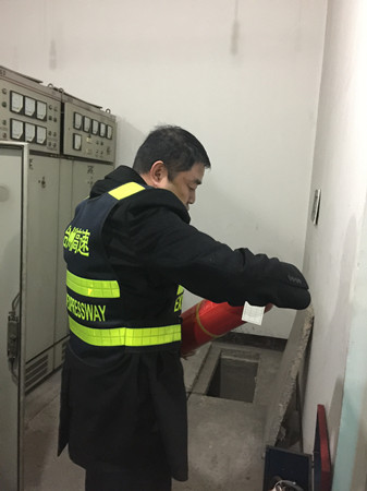 圖為檢查員在檢查配電房用電設備 檢查人員本著“防范在先、警惕在前”的原則,重點檢查了供配電房的供電設備運行狀況和消防設施。在供配電房,大家對環境衛生、發電機組的機油油位、電柴油儲備量、水箱水位等逐一進行檢查,并當場啟動發電機組,查看是否能夠有效運行,并仔細檢查了消防設施生產日期、日常巡查記錄,消防水池儲存水量是否充足等,確保能夠正常使用。
