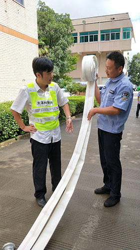 現(xiàn)場(chǎng),“馮大師”腳下放著兩盤水帶,站姿已成“丁”字步,雙腿微曲,兩拇指與食指握住水帶根部,使虎口以順時(shí)針方向?qū)?zhǔn)接口處,做好甩開的準(zhǔn)備。“甩第一盤水帶,要運(yùn)用手腕的力量,要提起水帶并高于地面20到30厘米,再用大臂帶動(dòng)小臂的力量向前甩出。” “馮大師”耐心地指導(dǎo)。