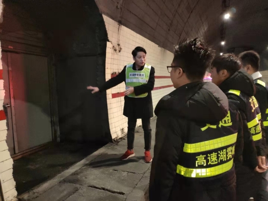 圖為羅鳴春對樂清市高速公路湖霧嶺隧道開發(fā)有限公司駐隧道南邊執(zhí)勤點的幾位新員工進行培訓 借此次隧道清洗良機,所長助理羅鳴春對樂清市高速公路湖霧嶺隧道開發(fā)有限公司駐隧道南邊執(zhí)勤點的幾位新員工進行業(yè)務培訓,帶他們進入隧道熟悉隧道內消防箱、人通、汽通的位置,并告知平時執(zhí)勤時的工作任務,詳細解說了隧道封道、卡口、路面執(zhí)勤、施救的操作流程,希望他們能盡快融入工作,為大溪嶺-湖霧嶺隧道平安暢通貢獻力量。臺溫雙方將持續(xù)合作,共同管理,共同維護好這條隧道。 陳智慧