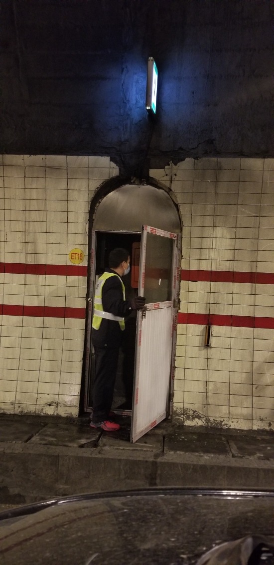 圖為工作人員在檢修緊急電話 此次隧道清洗,隧道所員工加班加點,檢查隧道內消防箱、檢修隧道風機和加強燈回路、修理故障的語音提示,對配電房機電設備進行除塵保養(yǎng),還檢測了火災報警、緊急廣播、緊急電話等系統(tǒng)。