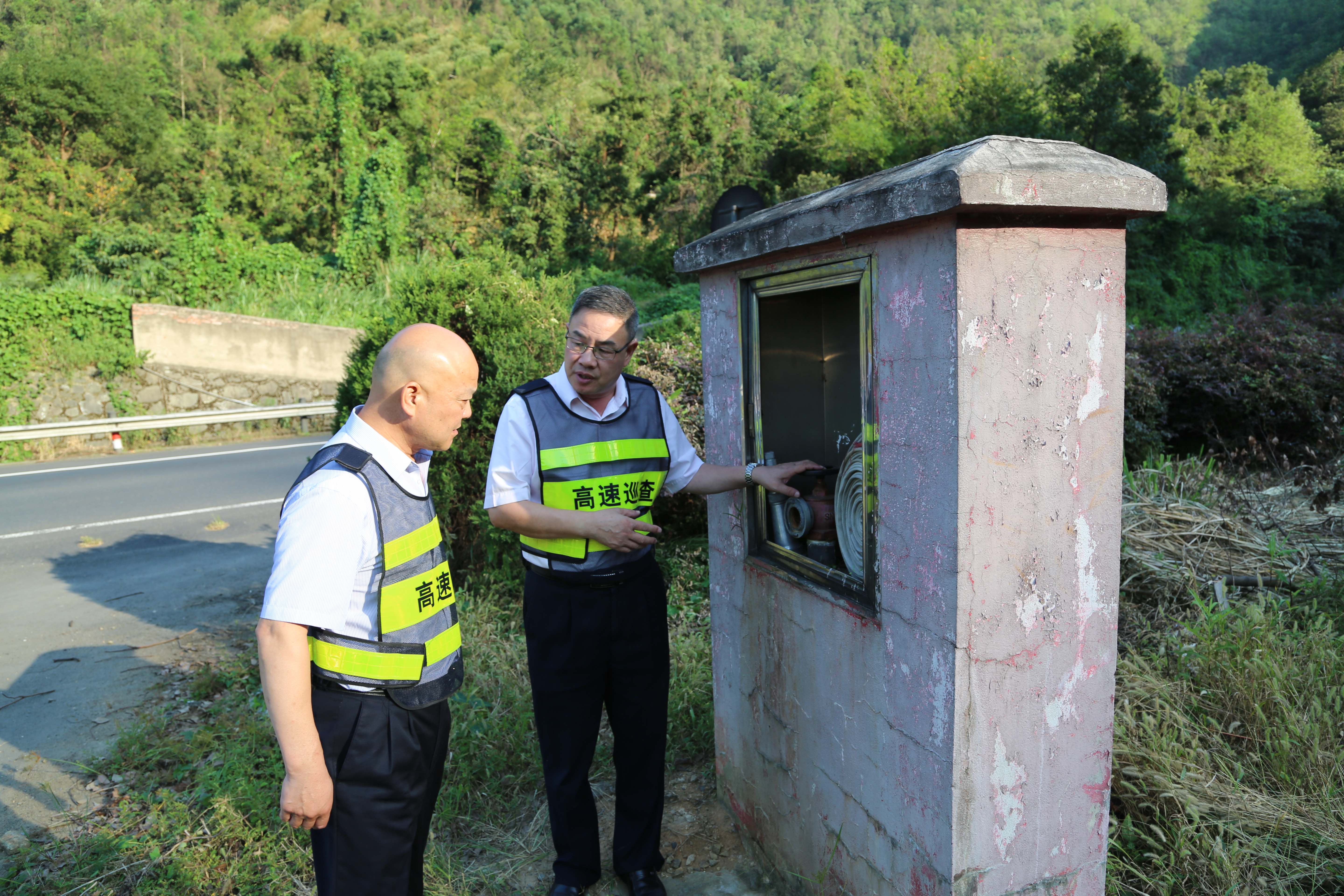 圖為陳文波一行查看消防設施 隨后檢查組一行針對公司路段沿線隔離帶樹木、塘嶺隧道、收費站內廣場防撞護欄等區域存在安全隱患的問題,檢查組進行了現場會商,給出了解決方案。 陳文波強調,中華人民共和國成立70周年大慶期間,做好安全保暢工作是嚴肅的政治任務,意義重大。陳文波要求全體員工要充分認識到國慶期間安全生產的重要性,要以高度的政治責任感、良好的作風抓好道路保安保暢工作,以“平安高速”嶄新的面貌,展現高速集團高質量發展的新風貌,向國慶70周年獻禮。 張波