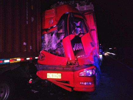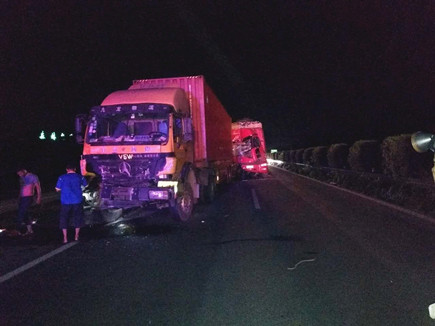 當以上事故處理完畢,施救人員正準備往回趕的時候,當晚23點10分左右,四輛大貨車在寧向1667K+300M處連環(huán)追尾,其中一輛紅色大貨車車頭嚴重變形并且不斷向外漏油。現(xiàn)場極不安全,情況危急,施救中心員工馬不停蹄,又一次拉響了救援車的警報,為了爭取時間,甚至通知了另外地點待崗的人員火速趕來,以便能及早處理。此時,施救中心當班人員已經(jīng)全體出動,全部戰(zhàn)斗在路上。
