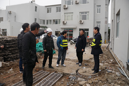 圖為集團總工程師江輝一行督查溫嶺西收費所管理房鋼結構室外排水排污施工進展