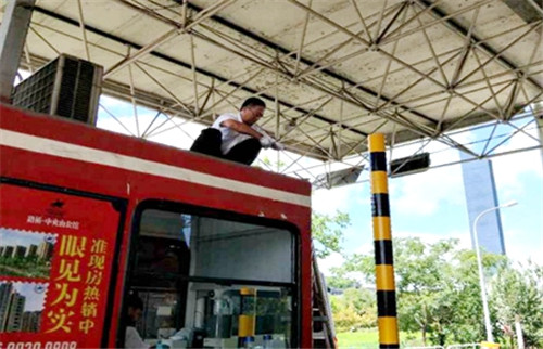 圖為收費所員工正在加固崗亭空調外機