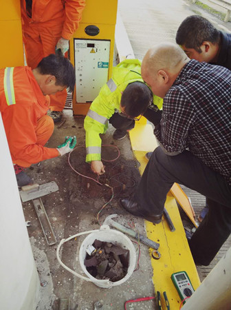 圖為工作人員對(duì)新欄桿機(jī)進(jìn)行接線