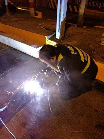 到了現(xiàn)場,隊(duì)員發(fā)現(xiàn)該車道輪檢器鐵板螺孔由于不斷摩擦并逐漸變大,導(dǎo)致整顆螺栓脫離底下固定螺座,加之當(dāng)天是春節(jié)高速免費(fèi)第一天,車輛經(jīng)過時(shí)車速都較快,直接將整塊鐵板帶離底座。如果不及時(shí)對(duì)鐵板進(jìn)行加工恢復(fù),不僅不能保護(hù)下面的輪檢器,而且還有可能造成車輛爆胎。可除夕夜全部加工廠都已關(guān)門,如果讓廠家發(fā)貨至少也要好幾天。正在兩難之際,中心副經(jīng)理葉俊想到將鐵板與底座邊緣直接焊死的臨時(shí)應(yīng)急方法,待節(jié)后再向廠家定制或重新購買。 方案有了,大家兵分兩組,一組去中心倉庫拿電焊機(jī)、電焊條等設(shè)備,一組待在原地清理鐵底下方於泥等雜物,為隨后的電焊工作做準(zhǔn)備。設(shè)備到位后,葉俊一手操起電焊罩,一手熟練的將電焊條點(diǎn)在了鐵板與底座邊緣之間,經(jīng)過近一個(gè)小時(shí)的處理,輪檢鐵板與地面底座牢牢地固定在一起,再也不用被飛馳而過的車輛帶離。 項(xiàng)寅曉