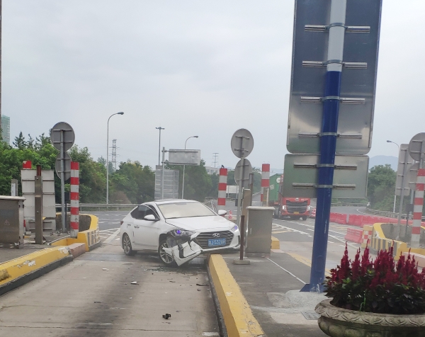 9月8日上午7點30分,一輛白色現代轎車在臺州收費所出口準備進入ETC車道時,突然撞向車道右側的全安島,在與安全島發生碰撞后,又一頭撞向了左側的安全島。 碰撞后的轎車半邊車身掛在了安全島上,車道上的光幕也因撞擊受損。收費班長在聽到一聲巨響后,第一時間跑上前去查看情況。因為劇烈的撞擊,轎車的右側已經在地上灑落一堆碎片。坐在副駕駛的女士從車上下來查看車況,隨后男司機也從另一邊打開車門下來。所幸撞擊并未造成人員受傷。班長在確認司機及乘客均無受傷后,一邊將事故報告監控中心讓施救車輛前來救援,一邊提醒司機報警,人員站到安全島上方,不要隨意在車道上走動。然后迅速跑到車道入口將水碼擋在車道口以防止有其他車輛誤入發生二次事故。