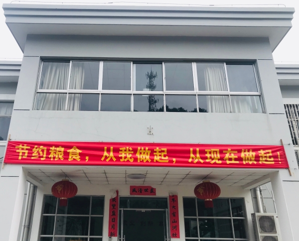 圖為懸掛宣傳語 除此之外,食堂大廳醒目的位置張貼著“適量打菜、不夠再添”、“倡導厲行節約、反對鋪張浪費”等宣傳標語,辦公樓等多處懸掛橫幅,并在飯桌上擺放“按需取量、杜絕浪費”提示牌,讓勤儉節約的意識慢慢滲透到員工們的日常生活當中,讓理性消費、“光盤”理念成為員工日常生活的一種習慣。