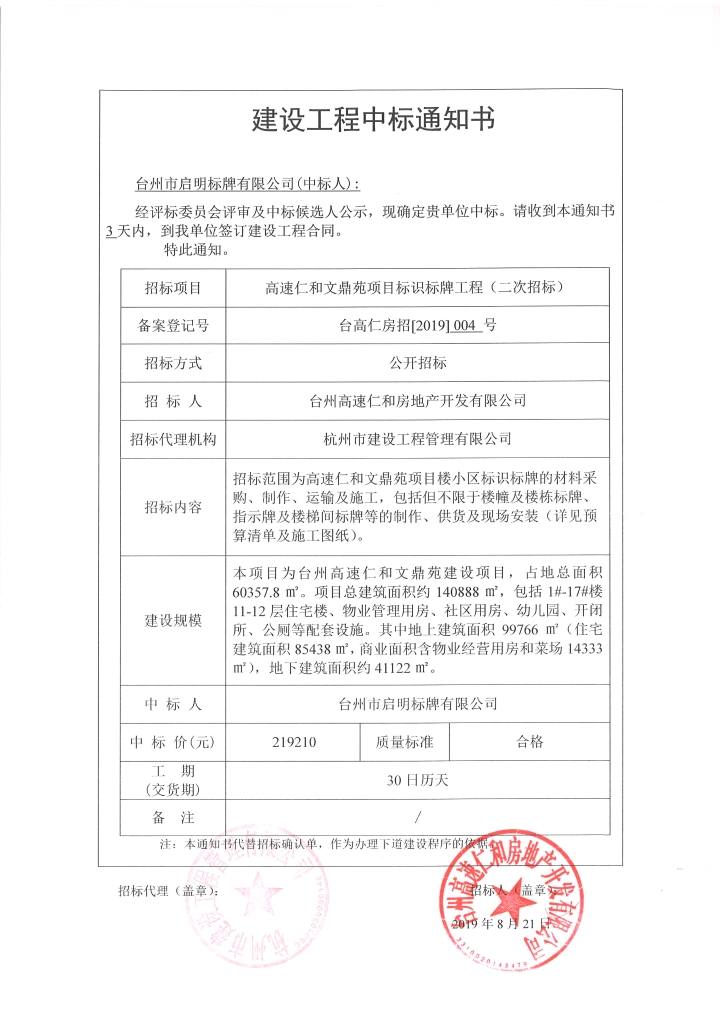 高速仁和文鼎苑項(xiàng)目標(biāo)識(shí)標(biāo)牌工程中標(biāo)通知書