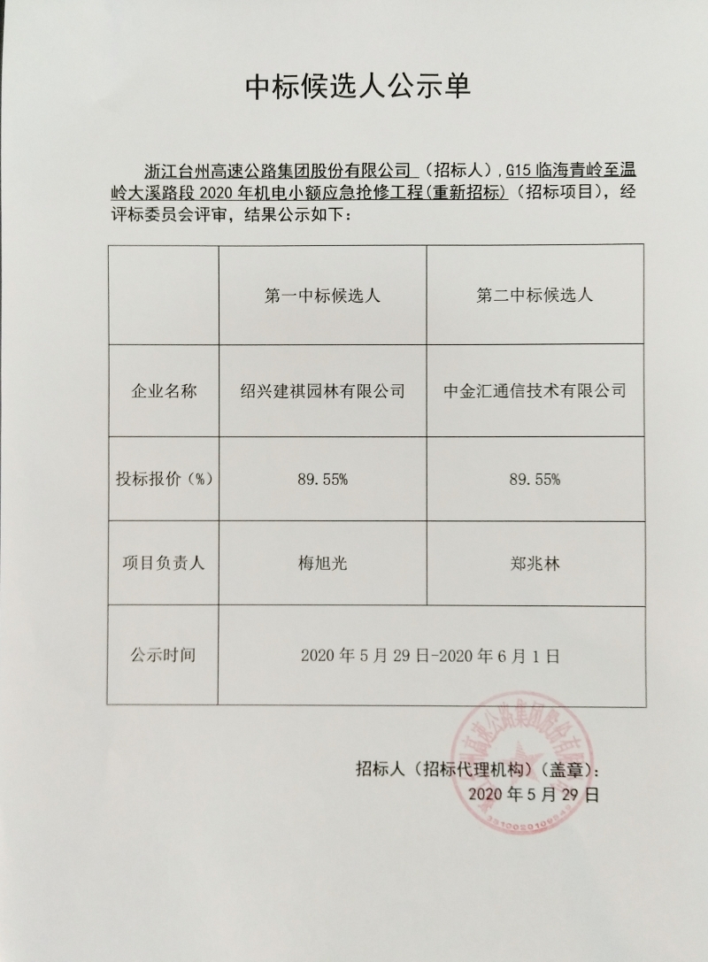 G15臨海青嶺至溫嶺大溪路段2020年機電小額應急搶修工程(重新招標)中標候選人公示單