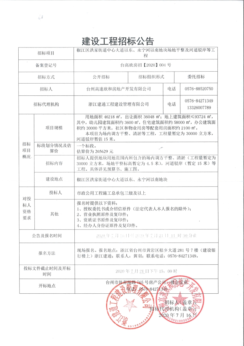 椒江區(qū)洪家街道中心大道以東、永寧河以南地塊場地平整及河道駁岸等工程招標(biāo)公告
