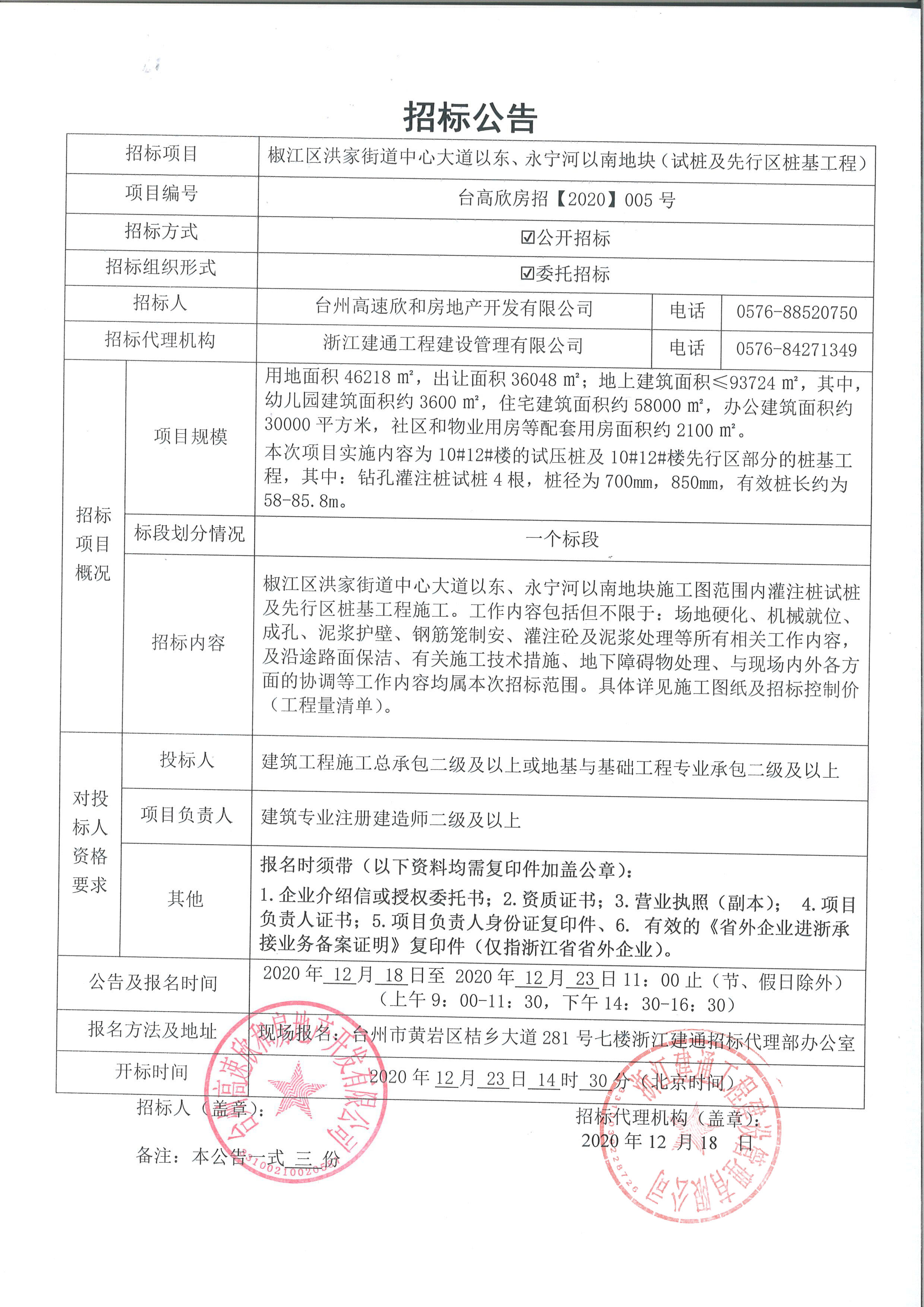 椒江區洪家街道中心大道以東、永寧河以南地塊(試樁及先行區樁基工程)招標公告