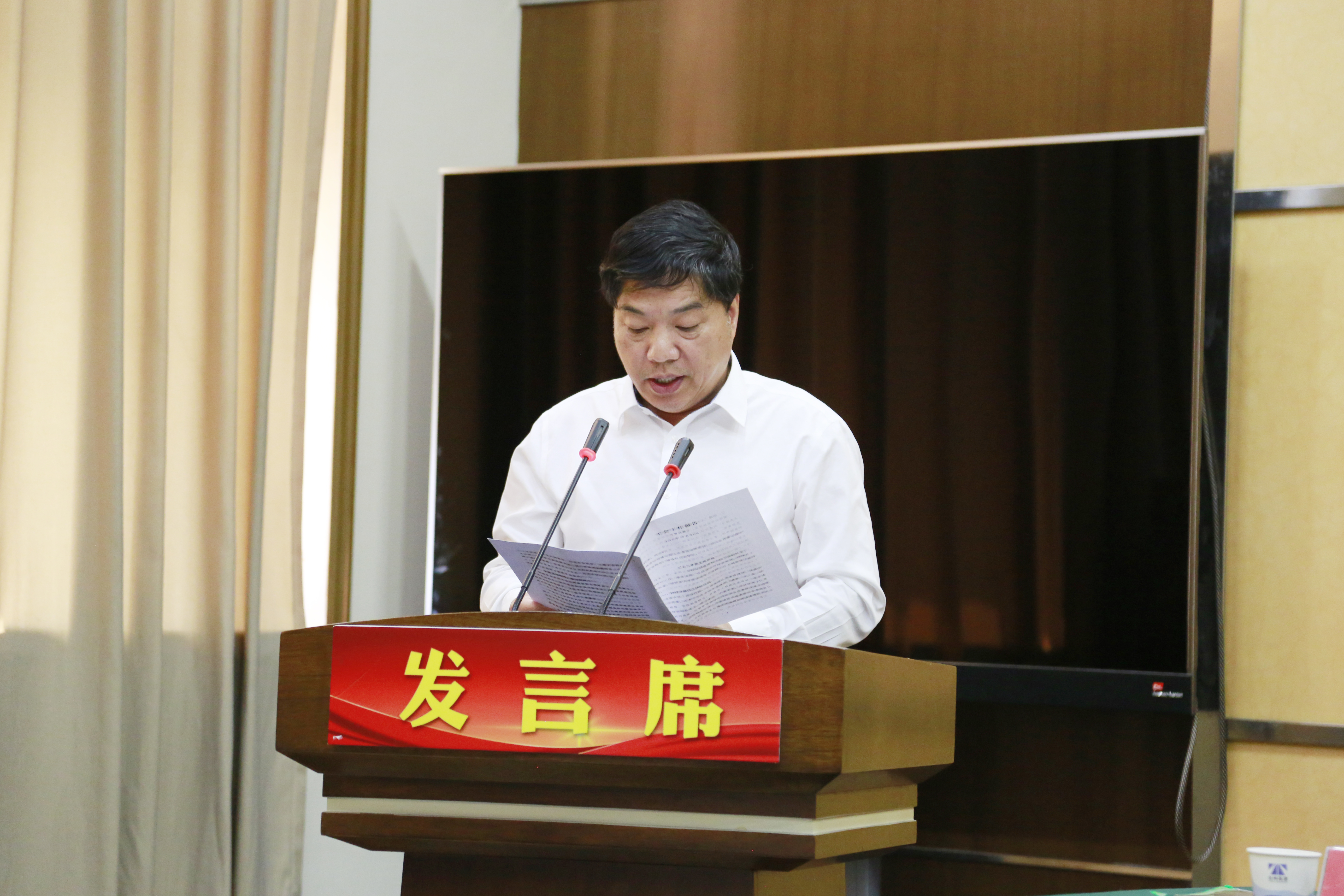 圖為項(xiàng)同富作第七屆工會(huì)委員會(huì)工作報(bào)告