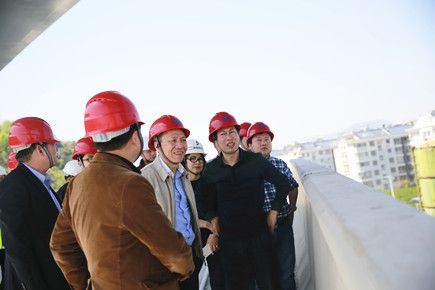 圖為公司總經(jīng)理張建平在8#立交橋上了解相關(guān)工程情況 張建平一行首先實地查看了內(nèi)環(huán)北路(江口段)項目工地,聽取工程進展情況匯報。在現(xiàn)場,只見爆破量達(dá)到70%的安然山體已經(jīng)開辟出一條可供工程車輛通行的大口子,耳邊不停地傳來機器忙碌作業(yè)的轟鳴聲。張建平一路由東向西穿行在施工便道上,看到施工區(qū)域一側(cè)各種安全防范設(shè)施有序排列,感受到沿途濃烈的施工氛圍,他對此表示滿意。 途徑內(nèi)環(huán)路8#立交項目工地時,張建平沿著臨時搭設(shè)的通道,爬上8#立交橋,遠(yuǎn)眺8#立交放射線項目所在地,向有關(guān)人員了解該項目前期準(zhǔn)備工作情況。眼下,距離11月11日內(nèi)環(huán)路主線通車僅剩下近半年的時間,張建平強調(diào),各部門要努力抓好施工進度,保證工程質(zhì)量,更要時刻將安全放在首位。 陳林偉