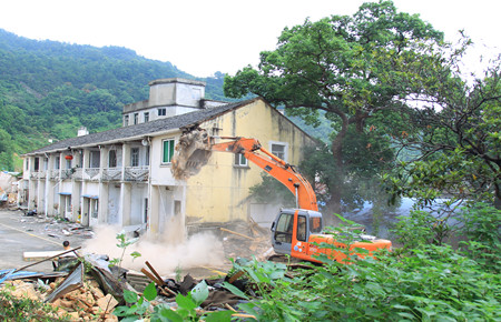 圖為挖掘機正在拆除軍產房屋