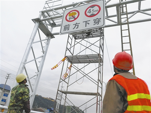 圖為工人在為內環路安裝標志牌。趙鵬攝